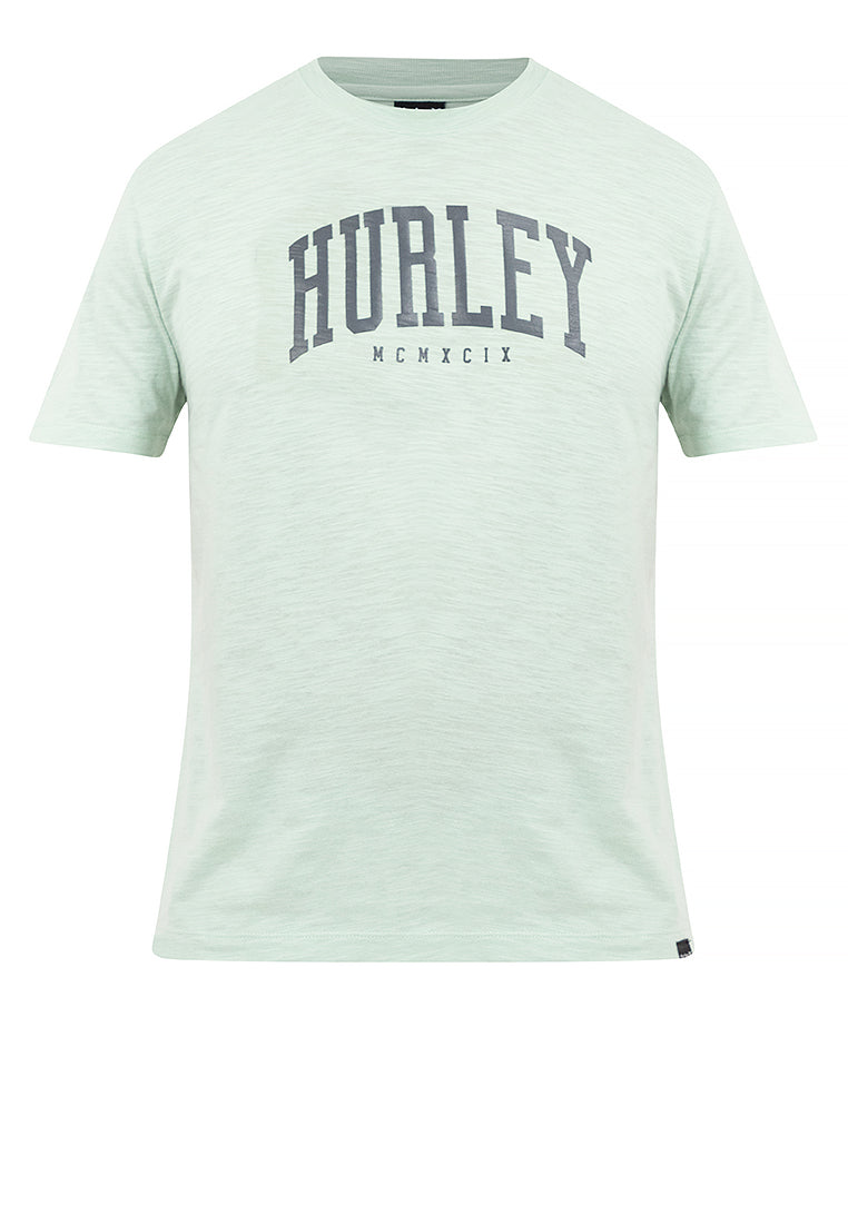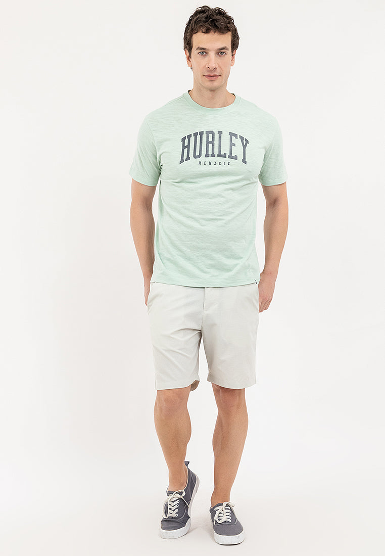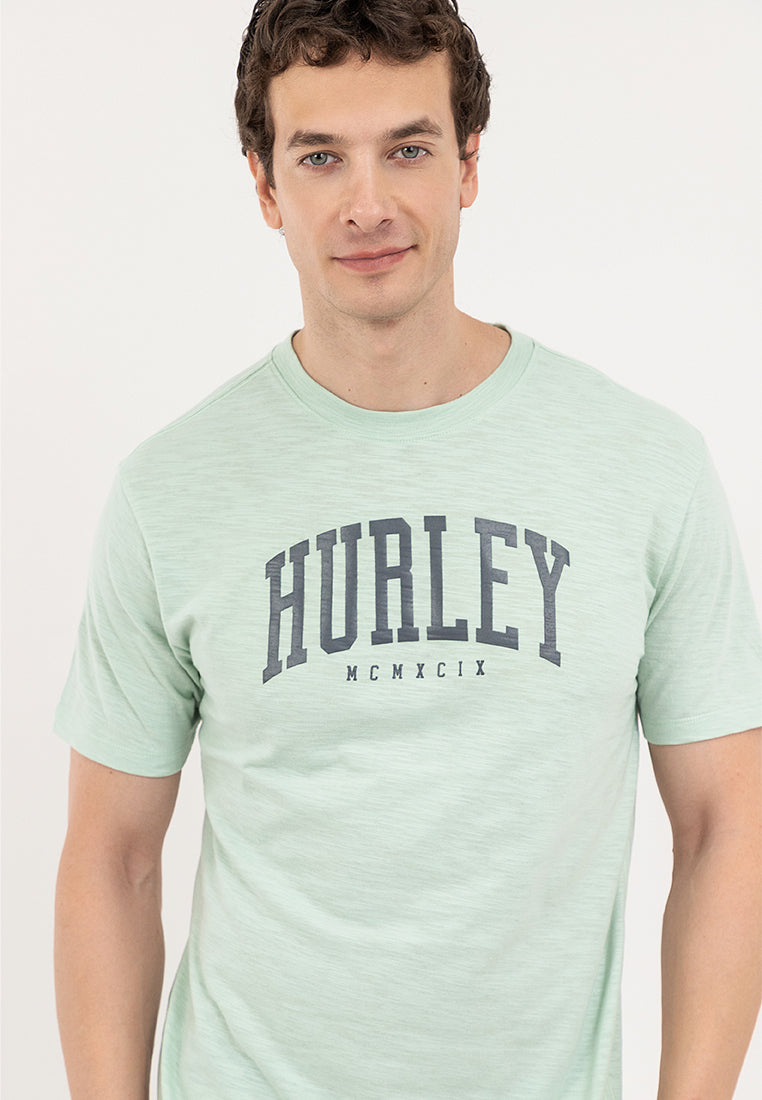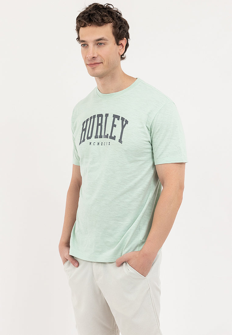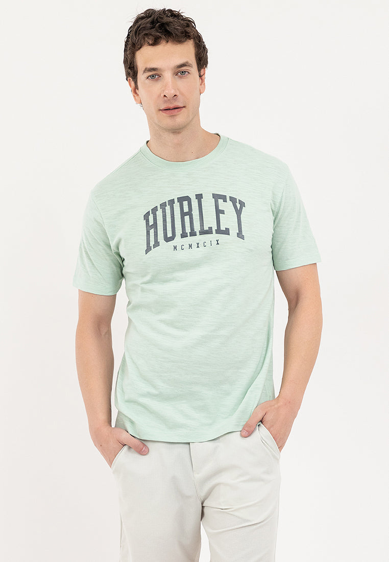Expand your wardrobe collection with Hurley's Men's Graphic Tee, cut from a muted colorway and finished with a collegiate-inspired branding across its chest for added statement.